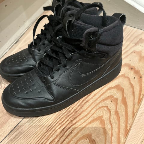 Et par sorte Nike sneakers i størrelse 36,5 med klassisk logo på siden og bagsiden. Skoene har en hvid sål, der viser tegn på almindelig brug med lidt snavs på. Skosnørebåndene er sorte, og skoene har en læderoverdel med perforering på tåområdet for ventilation.