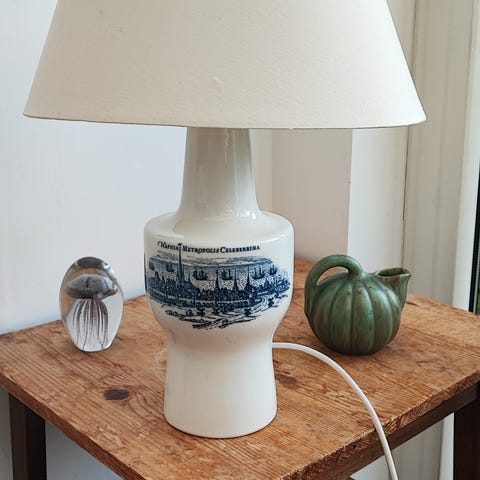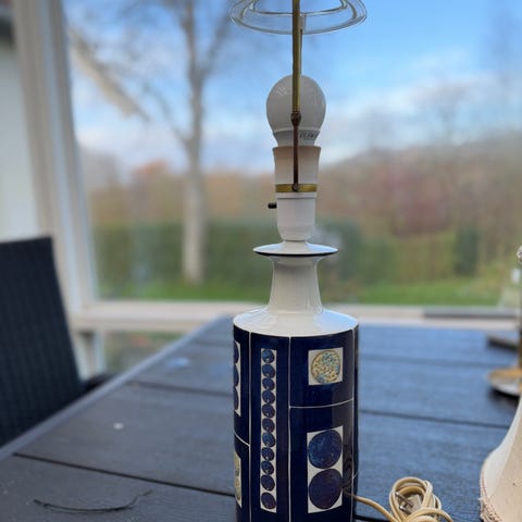 Denne formfulde bordlampe blev produceret i 1960'erne af lampeproducenten Fog & Mørup i samarbejde med den verdensberømte porcelænsproducent Royal Copenhagen. Denne sjældne lampe med serienummeret E 7165 er designet af kunstneren Kaj Lange. Lampefoden er dekoreret med to blå fyrregrene inklusive kogler, hvilket skaber en flot kontrast til den hvide porcelænskrop. På grund af den høje og slanke form og det tidløst smukke design ser denne lampe ekstremt ædel ud og er en stilfuld tilføjelse til dit hjem.