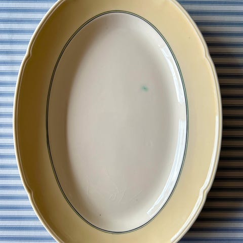 Dette er et ovalt porcelænsfad med en elegant krøllet kant og en enkelt grøn linje som dekoration. Fadet er 33x24 cm i størrelse og er fra Aluminia i serien Poul. Det har en enkel men klassisk udseende og kan bruges til servering af mad eller som dekorativt element i hjemmet.