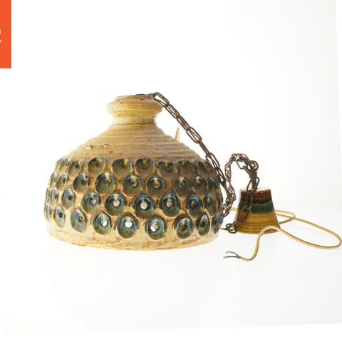 Denne vare er en pendel lampe lavet af keramisk materialer. Lampen er kugleformet med en ru tekstur, dekoreret med små huller og kommer med en metalkæde til ophængning. Den har dimensionerne 22x35 cm og har en indvendig fatning til pæreinstallation. Den brynede farve på overfladen giver et rustikt og klassisk udtryk. Passer perfekt til hyggebelysning i hjemmet.