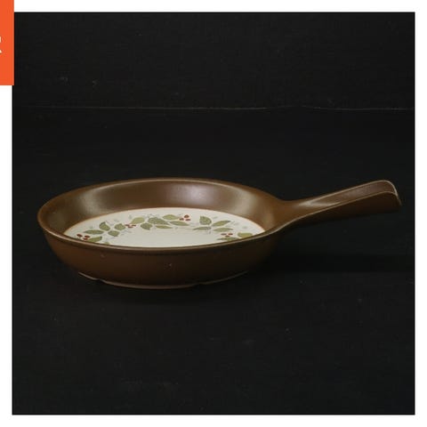 Et to-etagers serveringsfad med en metal håndtag, der gør det nemt at flytte rundt. Fadet er dekorativt med en mønstret overflade med bærmotiv på hvert niveau og en gul kant. Bagsiden af tallerkenen viser nogle mærker og logo, der kan indikere producenten.