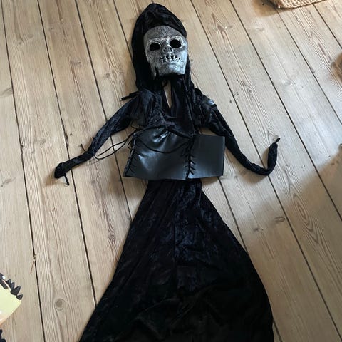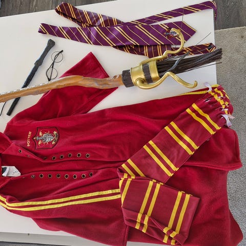 Hermione kostume i rigtig god kvalitet sælges inkl. original Hermione tryllestav i æske. Kostumet er købt fra udlandet og er i rigtig god kvalitet. Ikke det billige fastelavnsstof. Sættet indeholder kappe, skjorte, vest, nederdel, slips, halstørklæde. Diverse mål: Vest er 50 cm lang. Nederdel er 2x30 cm i talje, men har lidt elastik. Kappe er 100 cm lang. Sælges kun samlet.