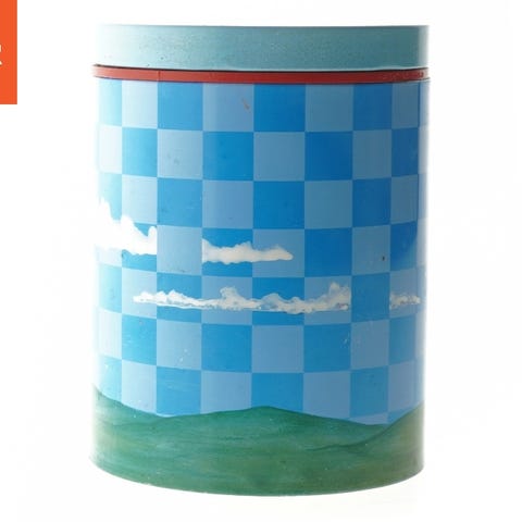 En dekorativ opbevaringsdåse fremstillet af metal. Dåsen er rund og har et mål på Ø. 11,5 cm med en længde på 15 cm. Den er designet med et blåt og grønt ternet mønster, der simulerer en himmel med skyer over en græsklædt bakke. Låget kan fjernes og er i samme blå farve som resten af dåsen.