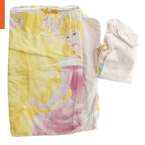 Et sæt børne sengetøj med prinsessetema. Sengetøjet har et farverigt design med ordet 'prinsesse' gentaget og illustrationer af slotte, kroner, og stjerner. Materialet ser blødt og komfortabelt ud, egnet til små børn. De angivne størrelser er 70x100 cm og 40x45 cm.