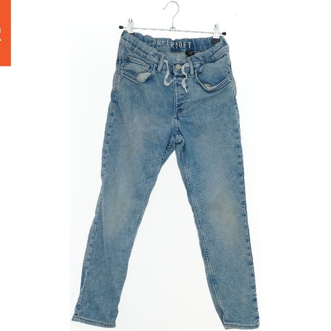 Par baby jeans i blå denim med elastisk talje og knaplukning. Bukserne har to forlommer og to baglommer. Størrelse er 68.