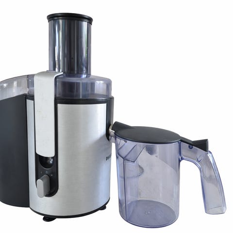 Dette er en Philips juicer designet til at udtrække saft fra frugt og grøntsager. Den er lavet af plastik og metal og har en strømledning med en stikprop til elektrisk tilslutning. Den har en gennemsigtig beholder og en tud til at hælde saften. En tilhørende målekande er inkluderet for at samle juice og måle mængden nøjagtigt. Juiceren har en vertikal top hvor frugterne kan tilføjes. Den generelle størrelse på enheden er 43 cm.