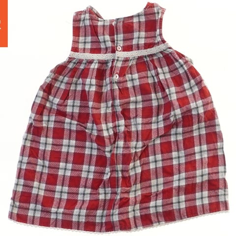 En børnekjole med beige overdel og en skørt dekoreret med et print af rensdyr og sneklædte landskaber. Kjolen har korte ærmer og en stor sløjfe på forsiden af skørtet. Der er en lynlås på bagsiden for nem af- og påtagning.
