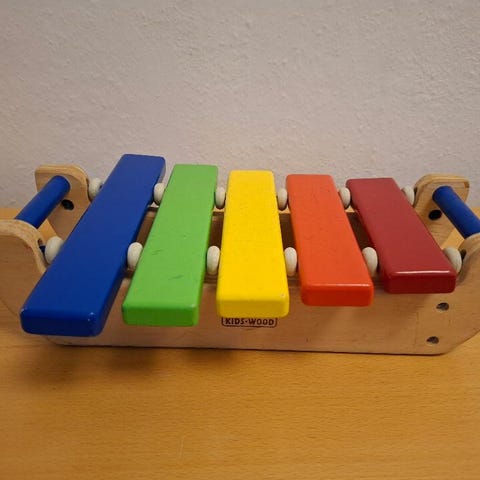 Dette er en farverig træ-xylofon designet til børn. Den består af fem plader i forskellige farver: blå, grøn, gul, orange, og rød. De er fastgjort til en træramme og kommer med to slåstokke. Xylofonen har en størrelse på 35 cm og er lavet af solide træmaterialer, hvilket gør den robust for almindelig brug af børn. Perfekt til at introducere børn til musik og rytme.