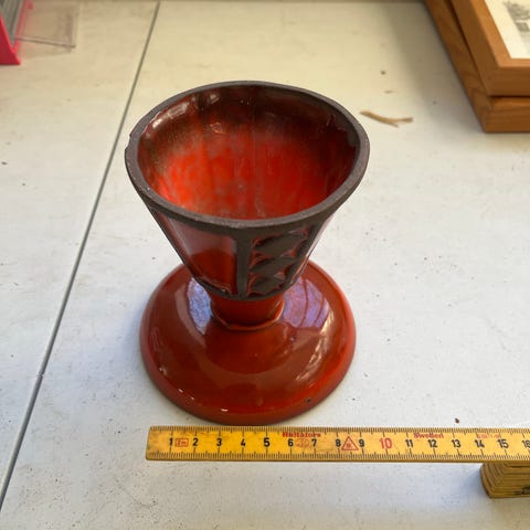 Frank Keramik vase i keramisk materiale med brun og sort farve. Vasen har et unikt design med en buet hank og dekorative mønstre.