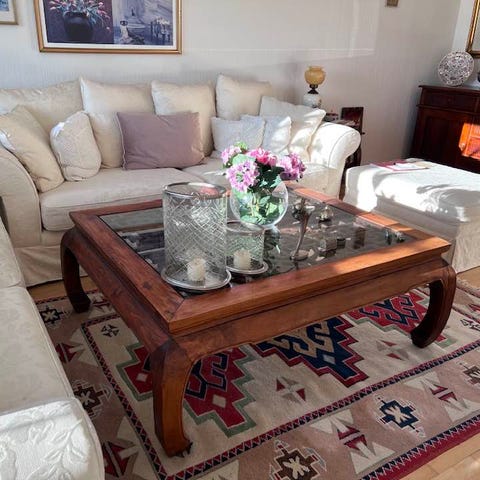 Sofabord/Coffee table I Mahogni finish, med Glas plade, og 2 x skuffer. Til udstilling af f.eks. Porcelæns platter der gør et flot display. Se evt. Billeder.