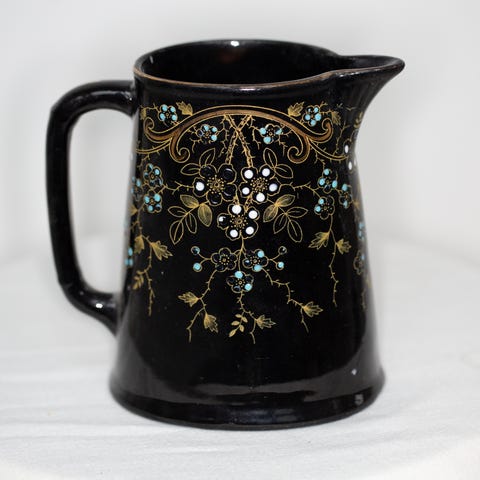 Denne antikke “Clock-jug” lustreware ( kobberglans) kande er antageligt fra Bristol, England, fra midten af 1800-tallet. Den er lavet af fajance med en metallisk, reflekterende kobberglasur. Kanden har en lilla (mulberry) transfertryk-medaljon, der forestiller en knælende kvinde foran et alter med et kors og ordet "FAITH" på den ene side og en urskive på den anden.
