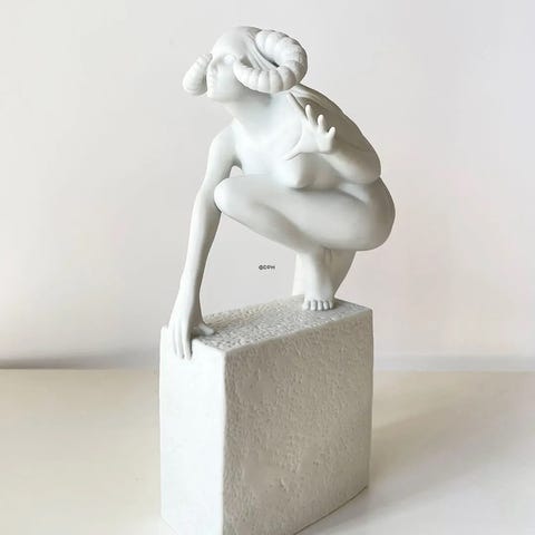 Royal Copenhagen Aries figur i porcelæn. Figuren forestiller en kvindelig skikkelse med vædderhorn og er designet med detaljeret udformning. Porcelænsfiguren har en hvid farve og er mærket med 'Aries' og Royal Copenhagen-logo på undersiden.