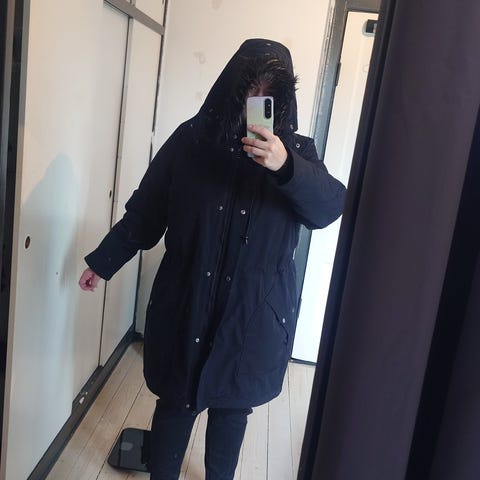 Skøn vinterjakke med indsnøring i taljen og hætte med aftagelig pelskrave.
