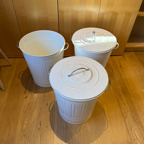 Sæt bestående af to emalje spande i farverne grøn og lyserød. Begge spande har træhåndtag og metalbøjle til bæring. Spandene kan anvendes til opbevaring, dekoration eller praktisk brug i hjemmet. Kost i fuld størrelse. Alt er i perfekt stand og købt i Roskilde Museumsbutik, nypris 650 kr. Kan afhentes i Roskilde.