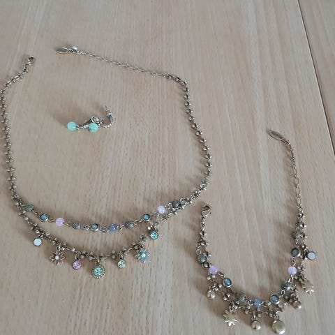 Pilgrim smykkesæt bestående af halskæde, armbånd og øreringe i sølv til kvinder. Smykkesættet har detaljer med indlagte dekorative elementer.