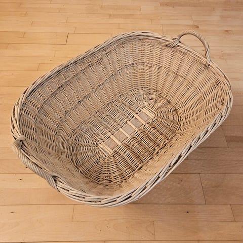 Denne kurv har sandsynligvis på et tidspunkt været brugt som krybbe, da den stadig har pind til ophæng af himmel. Denne er lige til at tage af og på.