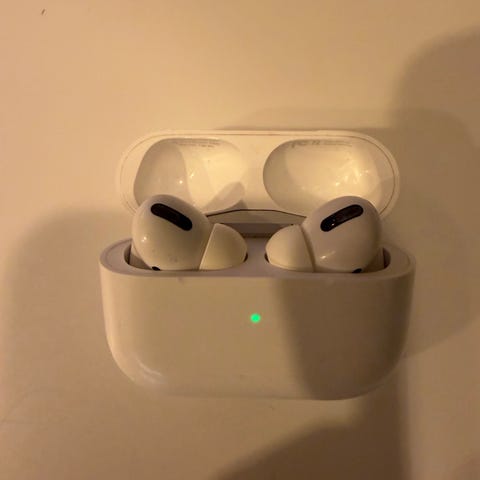 Apple AirPods Pro trådløse høretelefoner i hvid farve. Modellen har aktiv støjreduktion og leveres med et opladningsetui. Designet til at give en trådløs lydoplevelse med fokus på komfort og funktionalitet.