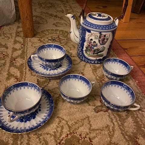 Porcelæn, te stel, Fire fine store blå tekopper og en tekande sælges samlet for kr. 350,-