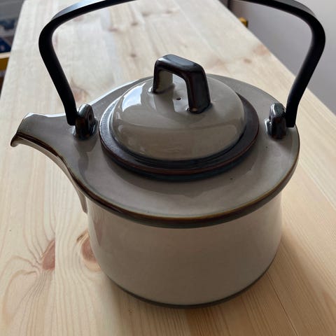 Bing & Grøndahl tekande med låg og flettet hank. Tekanden er fremstillet i keramik med et mønster af cirkulære blomster og har en grønlig glasur. Den har en rund form og et låg med knop. Tekanden har en flettet hank, der er fastgjort til kanden, hvilket gør den nem at bære og hælde af..