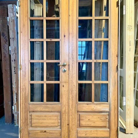 Fin, dobbelt glasdør med karm og bundstykke. Monteret med pæne greb og tilhørende nøgleskilte i messing.