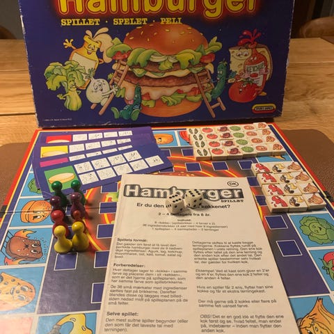 Hamburger brætspil med spilleplade, brikker og instruktioner. Spillet går ud på at lave den perfekte hamburger ved at samle ingredienser som rugbrød, løg, salat og mayonnaise. Indeholder forskellige spilleelementer til 2-6 spillere.