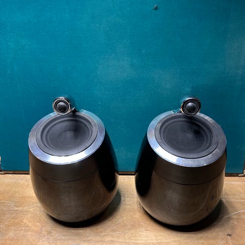 Philips Wireless Home Theater System højttalere med trådløs forbindelse, HDMI-understøttelse og Dolby Digital teknologi. Systemet består af flere højttalere og en subwoofer i sort og beige farve.