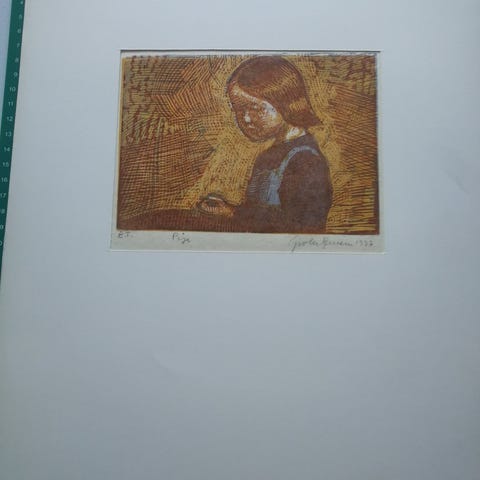 Et rigtig fint lille poetisk grafisk værk af Jens Peter Groth Jensen. Det er signeret i hånden i 1965 og det er eget tryk nr. 14/35 og titlen er “Barn og blad”. Selve trykket som er på tyndt papir måler 12x15 cm op det er sat på karton som måler 18x25 cm. Det specielt ved dette værk er at Groth Jensen har skrevet en personlig hilsen til en god ven.