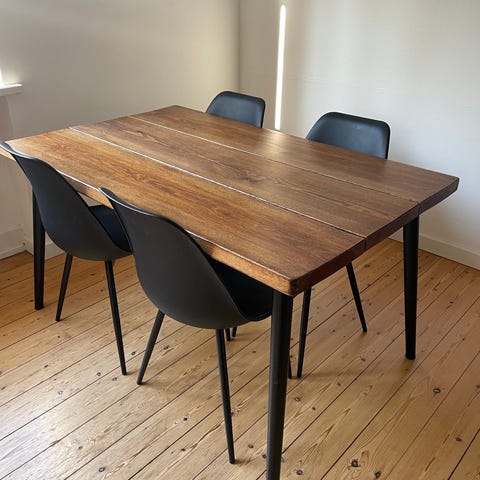 Pænt plankebord med lidt grålig nuance. Sælges sammen med de fire stole til. Bordbenene kan nemt tages af og udskiftes med noget andet, hvis man har lyst til det.