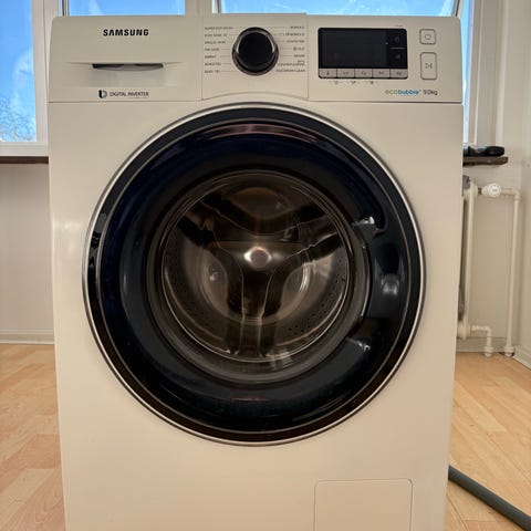 Samsung frontbetjent vaskemaskine i hvid farve. Vaskemaskinen har en frontbetjent åbning og er designet til almindelig husholdningsbrug.
