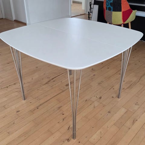 Jeg sælger dette fine spisebord fra Haslev Møbelsnedkeri. Det måler 90X90cm, og der medfølger 2 tillægsplader. Bordet har et par skønhedsfejl, ellers fremstår der i flot stand. Bordet sælges da det var et fejlkøb. Skriv ved interesse.