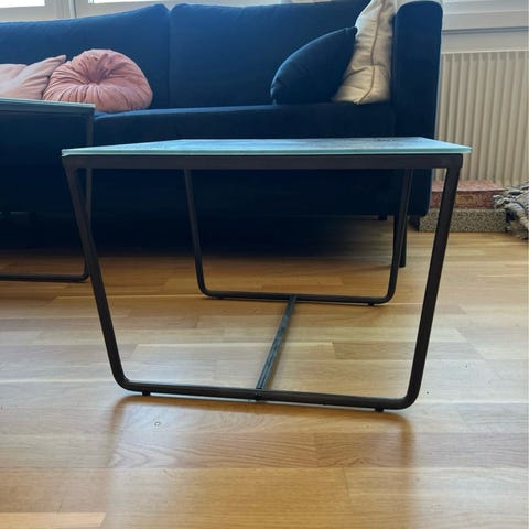 Har nogle synlige brugs spor i træet, som evt kan fikses med en slibning, glasset fejler intet og ellers fungere som den skal.