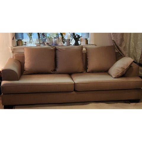 Meget komfortabel og vedligeholdt 3-pers. sofa i blødt chenille stof af polyester og aftageligt betræk på ryghynder. Den har holdt sig godt i de 3 år jeg har haft den. Fra røgfrit og dyrfrit hjem.