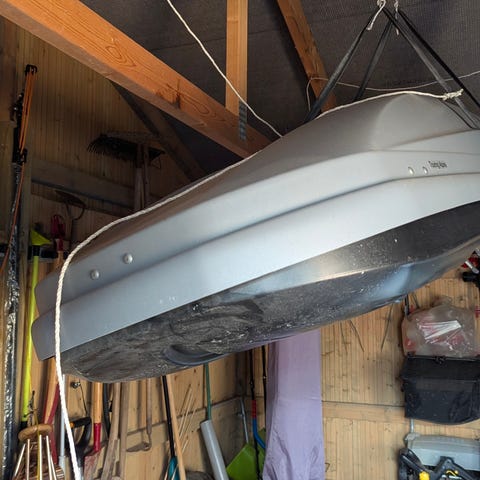 Skiboksen er brugt og kan kun åbnes i den ene side men er velholdt og har fungeret upåklageligt i mange år.
