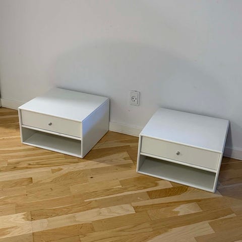 2 sengeborde sælges samlet. Meget holdbare og stabile, i mørkegråt stof. Har en stor skuffe i bunden med smalt metalhåndtag, og en lyskontakt i sort plastik med metal ramme. Ledning på bagsiden 120cm lang. Lyset kommer fra hele toppen, der er af glas og fremstår grå når lyset er slukket.