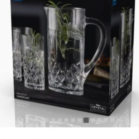 Brugt ca 3 måneder. Der er 2 kandesæt som for nyt koster 849kr stk (inkluderer 1 kande og 6 High Ball glas) udover er der 11 lave glas.