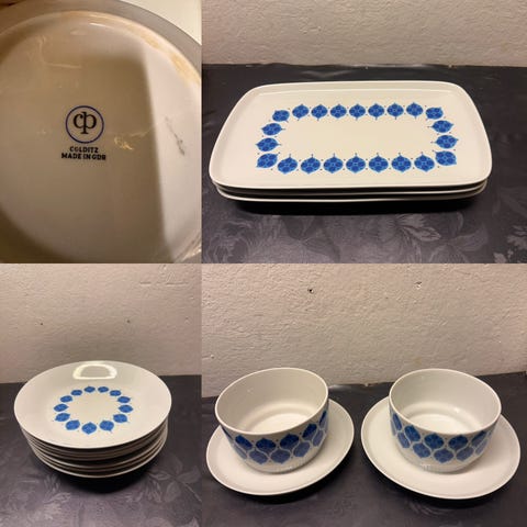 Spisestel med 10 af hver slags, middagstallerkener, suppe- / dyb tallerken, kagetallerkener, underkop. Kopperne er desværre bortkommet.