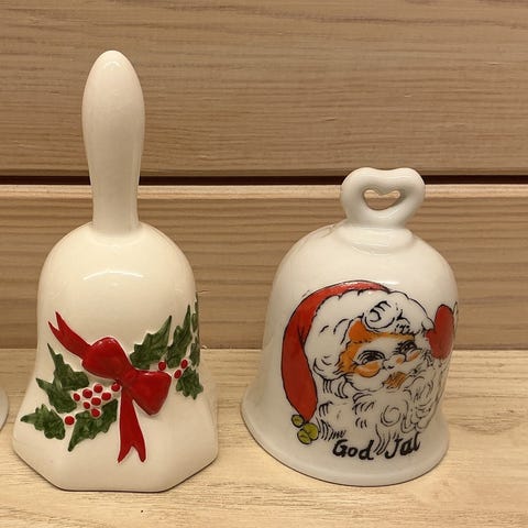 2 hvide juleklokker med kristtjørn og en glas klokke med en bamse som knebel og en lille kvist på toppen.