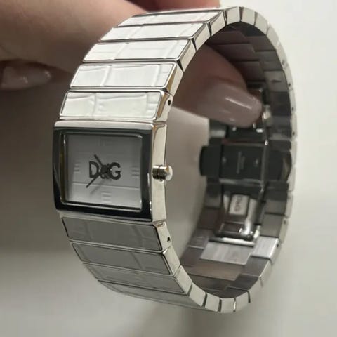 Dolce & Gabbana dameur med firkantet urskive og sølvfarvet metalarmbånd med similisten. Uret har et dekorativt design med mønstrede led, og urskiven er enkel med Dolce & Gabbana logo. Armbåndet kan justeres med medfølgende ekstra led.