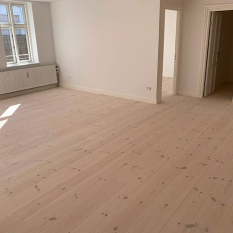 Du skal være forberedt på lidt ekstra arbejde i form af skæring og sortering. Der kan forekomme knaster og småfejl, men mange vælger at spartle knasthuller i stedet for at skære fra – det giver et naturligt og levende udtryk i gulvet.