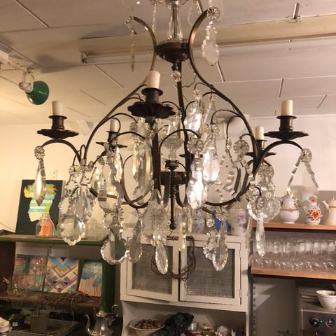 Gammel fransk lysekrone til stearinlys. Klare, lilla og rosa prismet