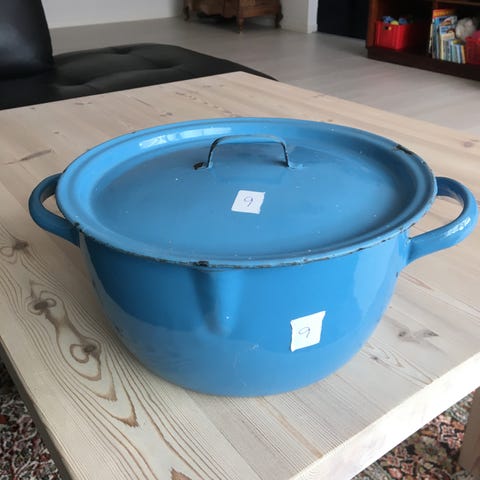 Kedel 20 cm høj incl låg. 14,5 cm i diameter nederst. Ca 19 cm i diameter på det bredeste sted.Stemplet (delvist slidt af)