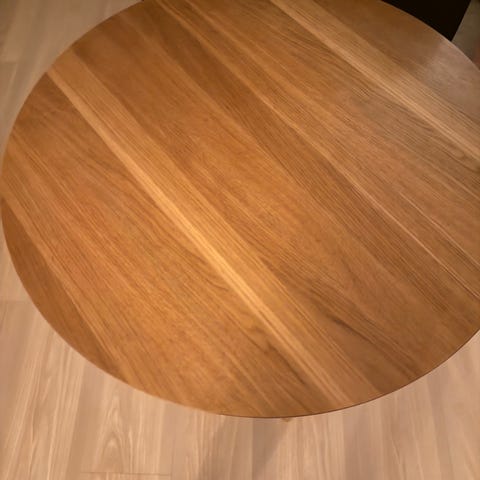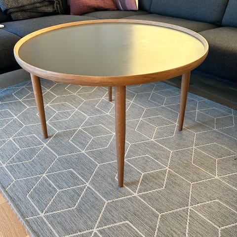 Velholdt sofabord med bordplade i egefiner. Stel i sort metal. Mål: diameter 90 cm højde 40 cm