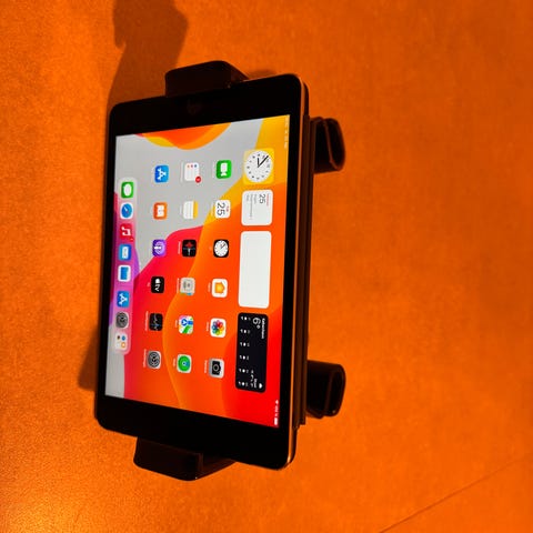 Hvid IPad holder med fleksibel arm og klemme til fastgørelse. Holderen er designet til at holde IPad sikkert på plads og kan justeres efter behov. Mærket Kakusiga.