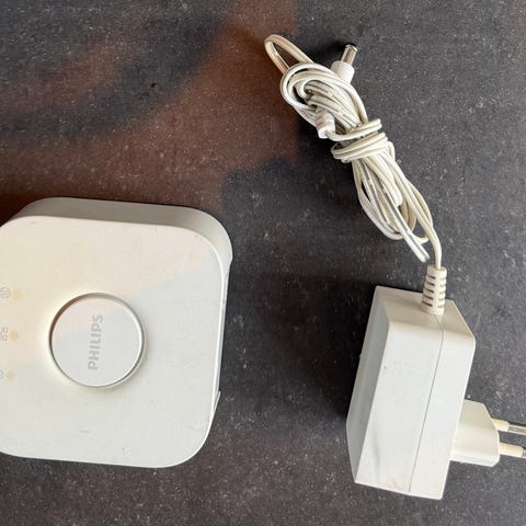 Original Philips Hue Bridge i fungerende stand. Medfølger original strømforsyning og kabel. Hubben bruges til at styre Philips Hue-lamper via app og smart home-systemer. Normal brugsspor, men fungerer som den skal. Klar til brug.