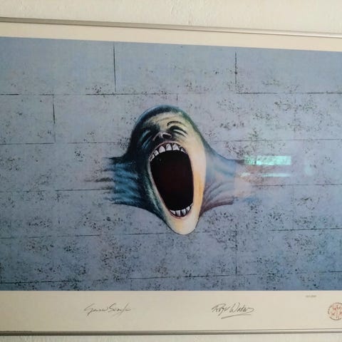 Original Pink Floyd Wish You Were Here plakat fra 1975. Plakaten er indrammet med sort ramme som følger med.