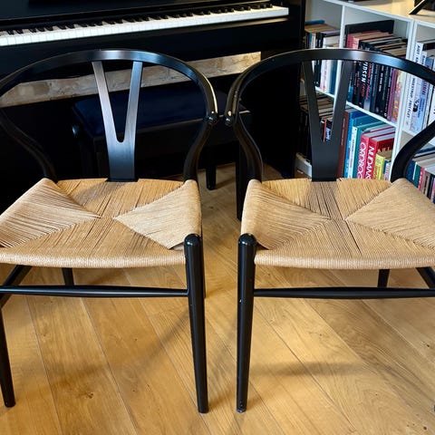 2 stk. y-stol i sort eg med tilhørende cognacfarvet hynder. I meget pæn stand.