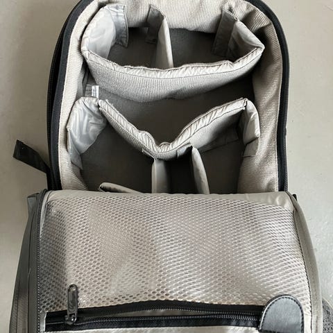 Lowepro kamerarygsæk med flere polstrede rum til opbevaring af kameratilbehør. Rygsækken er sort og designet til at beskytte og organisere kameraudstyr under transport.