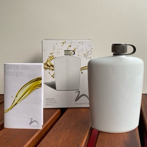 Glasflaske i etui af kernelæder og med metaloverdel. Dobbelt skruelåg så den med sikkerhed holder tæt. Du kan loppesjoppe den for 80 kr.