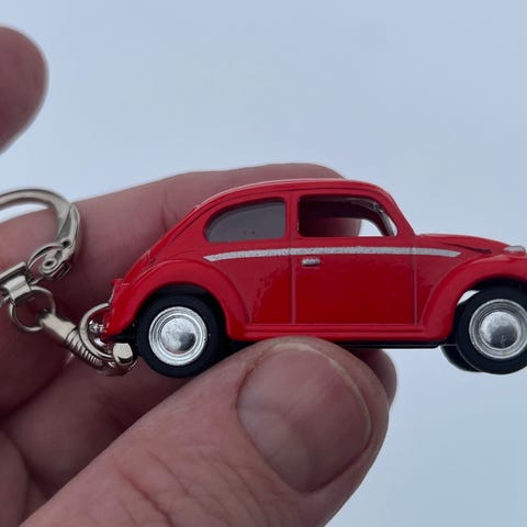 Volkswagen T1 Minibus nøglering i rød og hvid farve. Nøgleringen er en miniaturemodel af den klassiske Volkswagen T1 minibus og har detaljer som hjul og vinduer. Egnet til brug som nøglering eller som samlerobjekt.