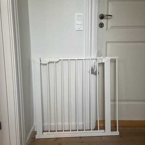 BabyDan børnegitter i hvid metal. Designet til at sikre børns områder i hjemmet ved at skabe en fysisk barriere. Kan monteres i døråbninger eller trapper for øget sikkerhed.